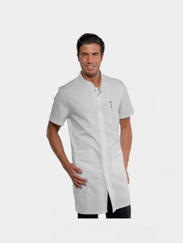 Camice Antiacido da uomo bianco con manica lunga, lungo 100cm, con bottoni a pressione, 2 tasche e taschino sul petto.