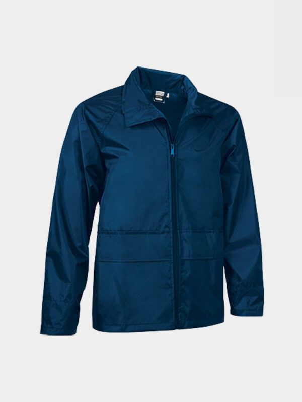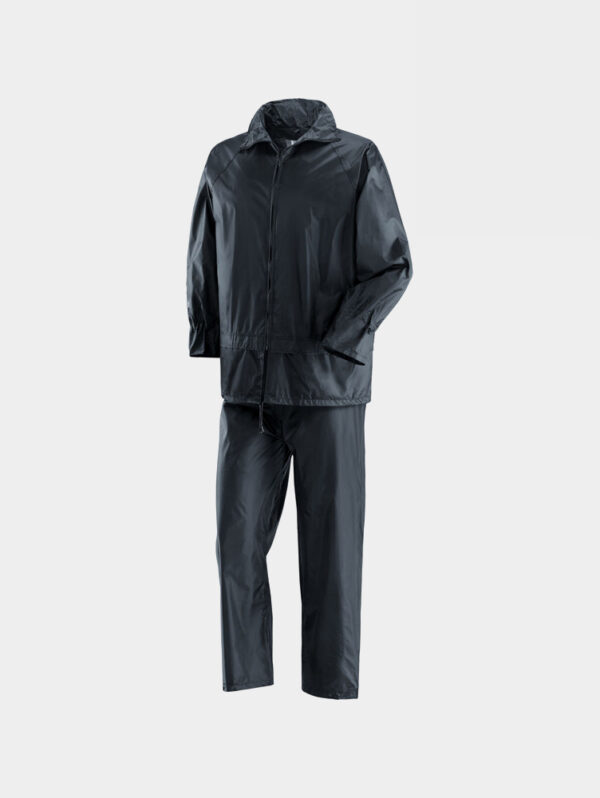 É composto da giacca con cappuccio fisso, chiusura zip anti-freddo, maniche raglan, polsini interni e due tasche funzionali con chiusura a pattina e pantalone con elastico in vita e chiusura a pressione.