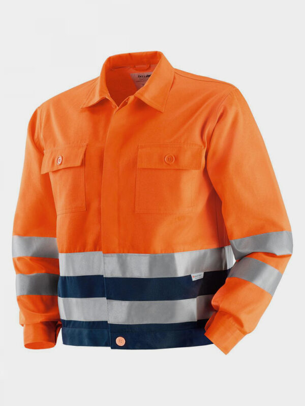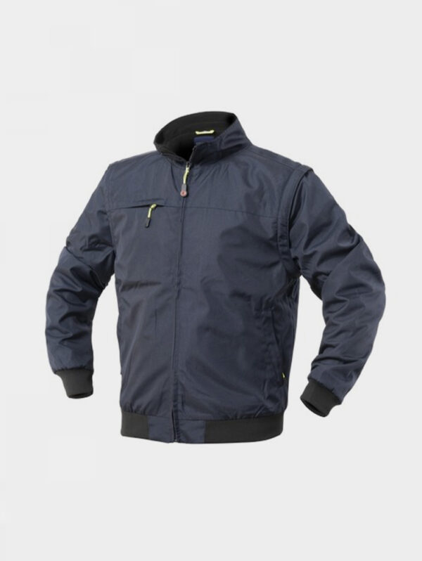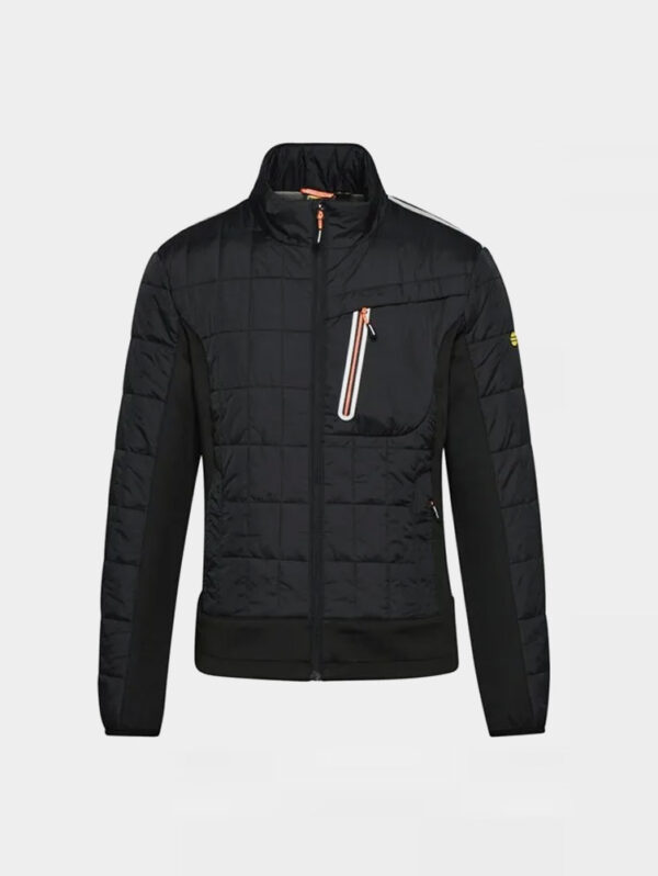 Un taschino a filetto al petto destro chiuso con zip waterproof verticale e profilo rifrangente, due tasche inferiori a filetto chiuse con zip waterproof, carré e foro di aerazione su schiena, polsi profilati con bordo elastico, inserti di colore a contrasto. 6000 mm WP / 3000 MVP.