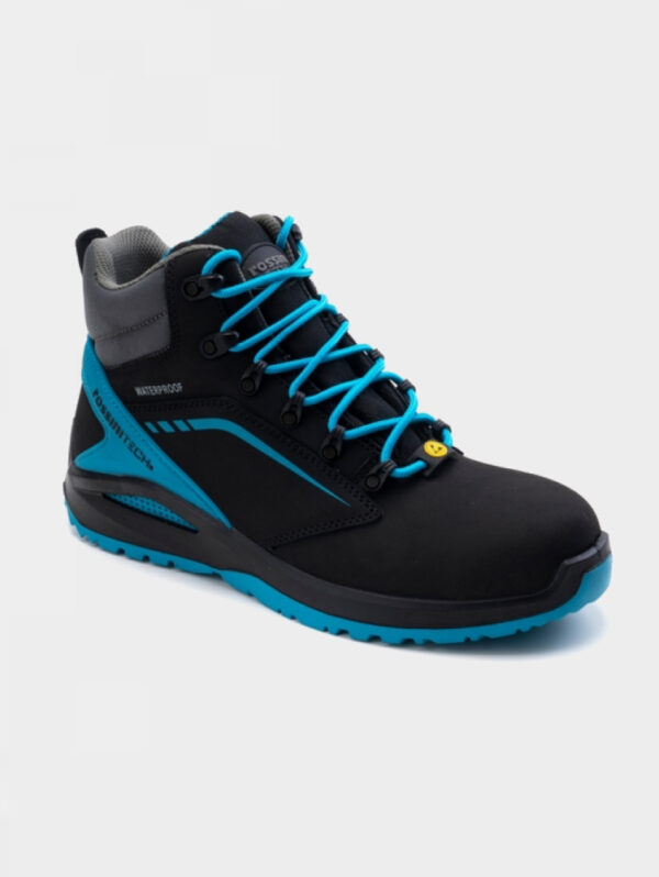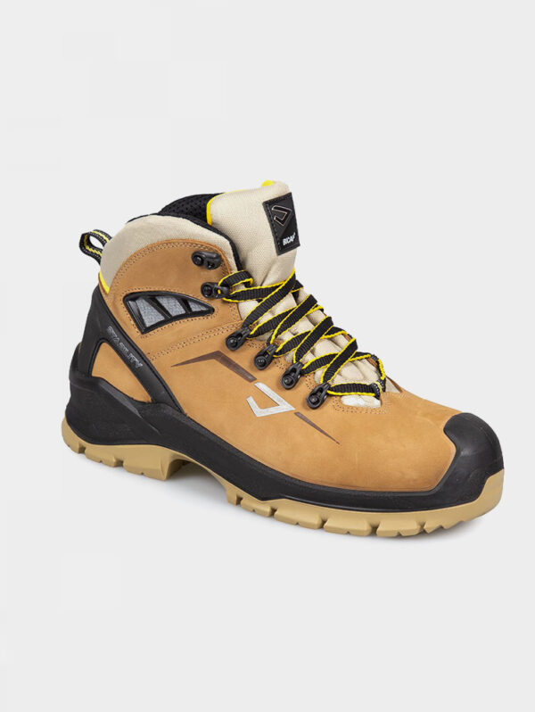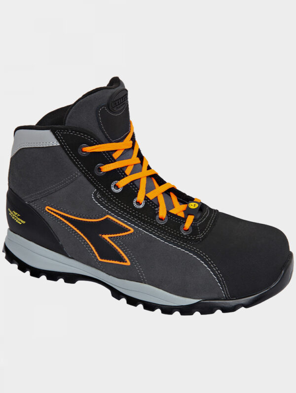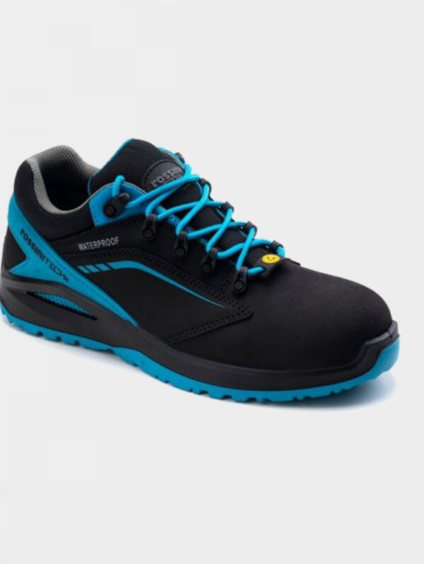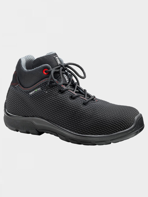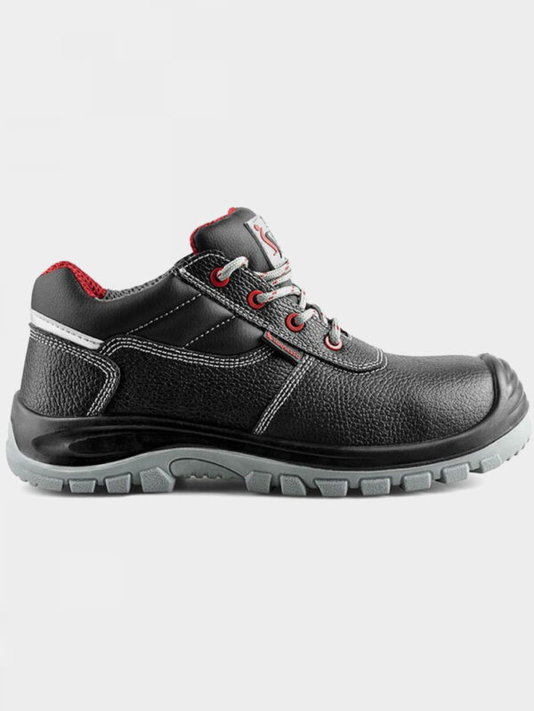 Calzatura bassa con puntale e lamina in acciaio. Tomaia in pelle. Suola con spunterbo in poliuretano bi-densità antiscivolo, antiolio, antiacido, antistatica